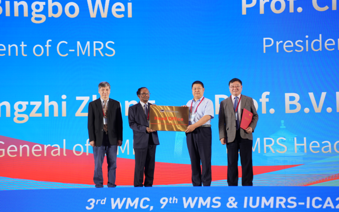 During the conference, the handover ceremony of the International Union of Materials Research Societies (IUMRS) headquarters was held. Professor Anil Kumar, President of IUMRS, announced that starting from January 2026, the IUMRS headquarters would officially relocate to China and be managed by the Chinese Materials Research Society. Academician Wei Bingbo, President of the Chinese Materials Research Society, formally received the authorization letter from IUMRS President Professor Anil Kumar, handed over by Professor Chaobin He, President of the Materials Research Society of Singapore. Professor Zhang Zengzhi, Secretary General of the Chinese Materials Research Society, received the IUMRS headquarters plaque from Professor B.V.R. Chowdari, Executive Director of the Materials Research Society of Singapore.